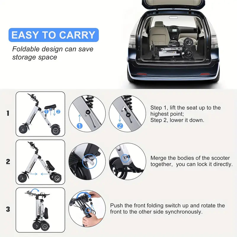 Say goodbye to bulky bikes and hello to modern mobility. Our Electric Foldable Tricycle combines performance, portability, and sleek design, making it your perfect ride for daily commutes or weekend adventures.