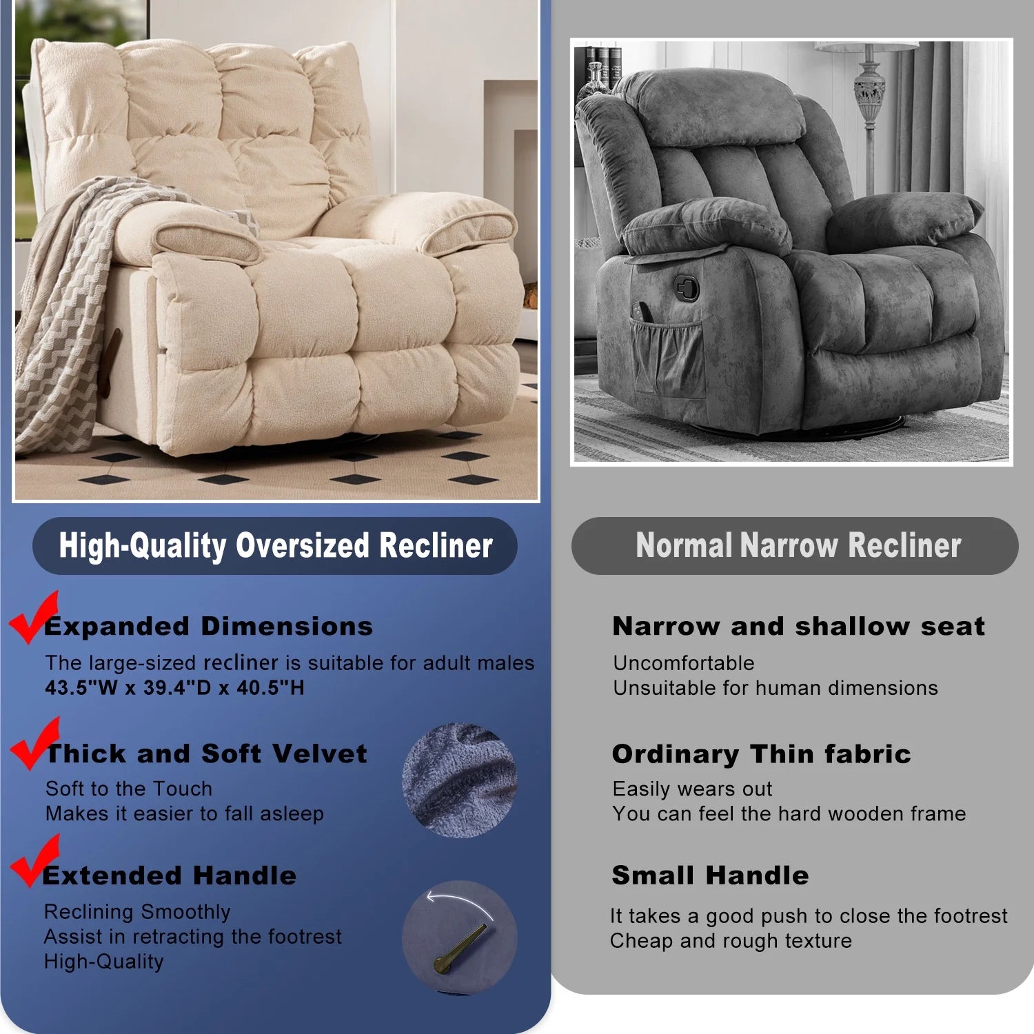 Experience comfort on a whole new level with our premium oversized rocker recliner—built for those who want space to stretch, the freedom to move, and the ultimate in relaxation. With extra-wide dimensions of 43.5"W x 39.4"D x 40.5"H and a deep, supportive seat, this recliner isn’t just furniture—it’s your personal retreat after a long day.